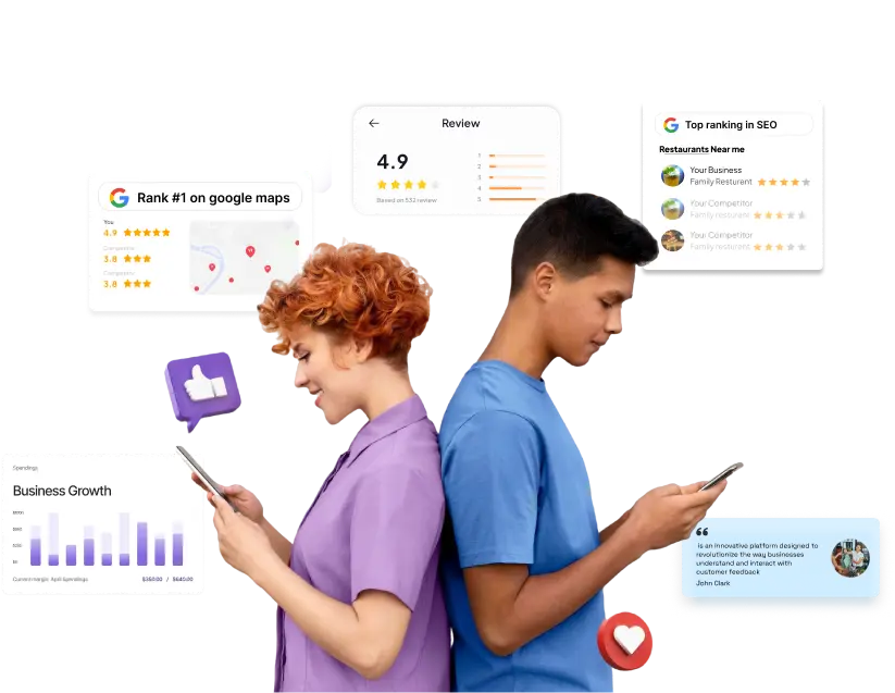 Unlike most customer review companies, we don’t just help you gather reviews. It could be about getting more Google reviews or encouraging customers to start leaving reviews – relax, it’s all covered! Plus, while you are juggling your umpteen business needs, we’ll help you rank #1 on Google Maps, boost your local SEO, and attract more customers than ever!